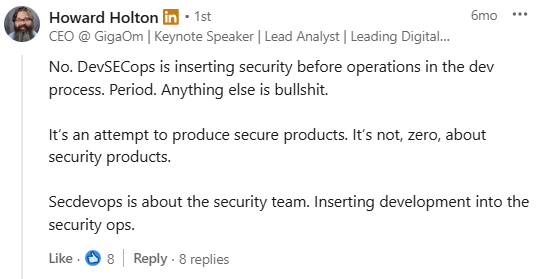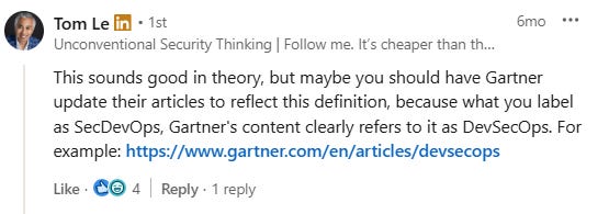 But really, most comments I got are challenging “insertion” vs “prepending”. You insert Sec in DevOps, so you get DevSecOps. You don’t prepend Sec to DevOps to get SecDevOps (even though it sounds like Secure DevOps, which is the point)